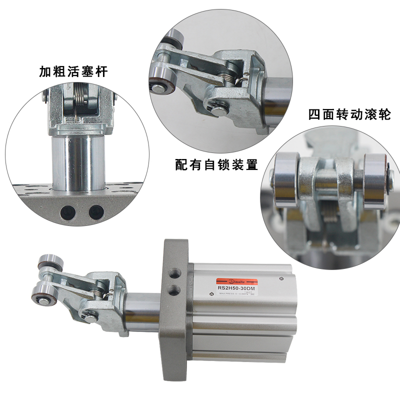 3、杠桿式滾輪結(jié)構(gòu)阻擋氣缸配有自鎖裝置,阻擋氣缸可防止搖臂回彈對被阻擋物體的回推;