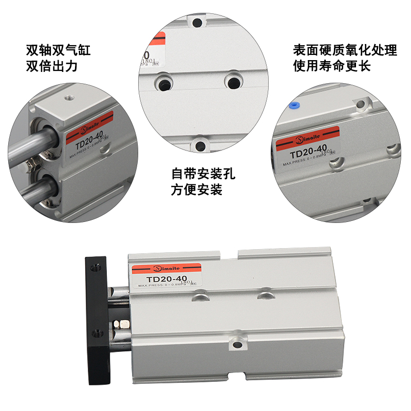 1、TD系列雙軸氣缸是雙軸雙氣缸,實現(xiàn)雙倍出力;